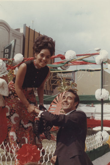 Dole shaking hands with woman on float | Dole Archive Collections