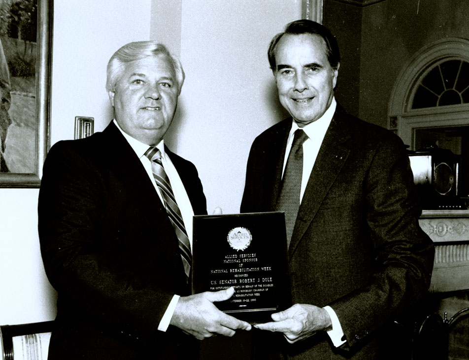 Sen. Dole accepts plaque from Allied Services, national sponsor of National Rehabilitation Week, for his work as chairman of the event.