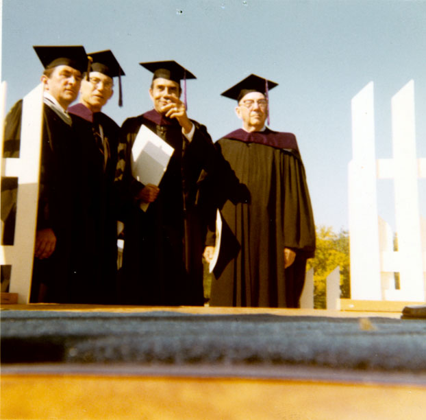 Dole, Robert J. 1923-; Commissioner Hatcher is on the right, Justice White and President Henderson are on the left. The snapshot was taken when Bob Dole received a honorary LLD [Doctor of Law] degree from Washburn University. The photograph originated from constituent , Issue Mail under Supreme Court correspondence, 3 of 4