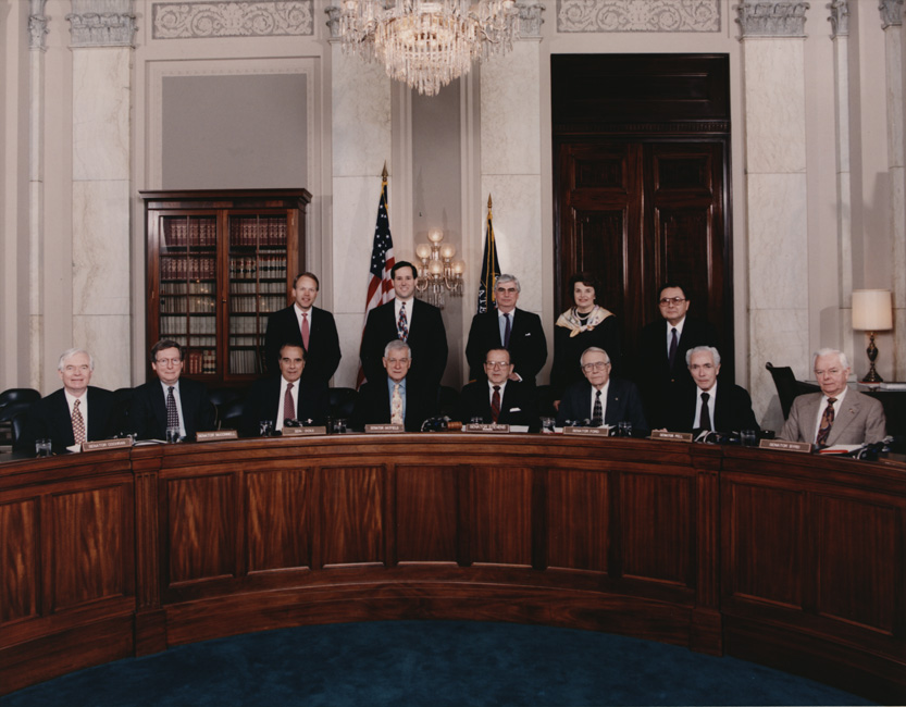 Pictured: Thad Cochran, Mitch McConnell, Bob Dole, Donald Lee Nickles, Mark Hatfield, Rick Santorum, Ted Stevens, Christopher Dodd, Dianne Feinstein, Wendell Ford, Daniel Inouye, Claiborne Pell, and Robert Byrd.
