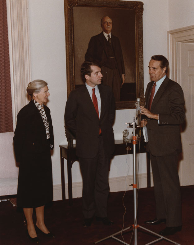 Item 1: Unveiling of Charles Curtis' portrait. 1/25/1985. Unidentified female; Carlin, John William; Dole, Robert J., 1923-; In portrait: Curtis, Charles, 1860-1936; Senator Dole, Governor Carlin and a woman stand next to the recently unveiled portrait of Vice-president Charles Curtis.