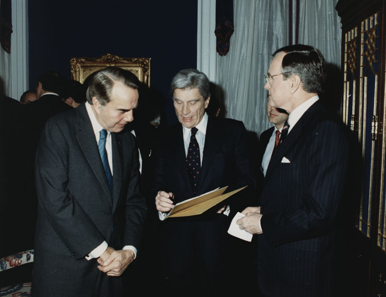 Item 1: Sen. Warner showing Sen. Dole a document. 9/7/1989. Dole, Robert J., 1923-; Warner, John W., 1927-; Nickles, Don; Bush, George H.W., 1924-; Sen. Warner is showing a document to Sen. Dole while President George H.W. Bush and Sen. Nickles stand by; in the Cabinet room.