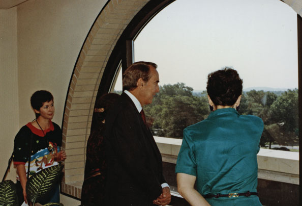 Senator Bob Dole looks out over the Wakarusa valley from an upper window of the Dole Human Development Center on the KU campus on dedication day of the building. An unidentifed woman stand to the right of Sen. Dole. Judy Krueger is at left in the image.