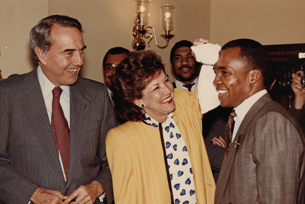 Elizabeth Dole wiping Sugar Ray Leonard's forehead with towel | Dole Archive Collections
