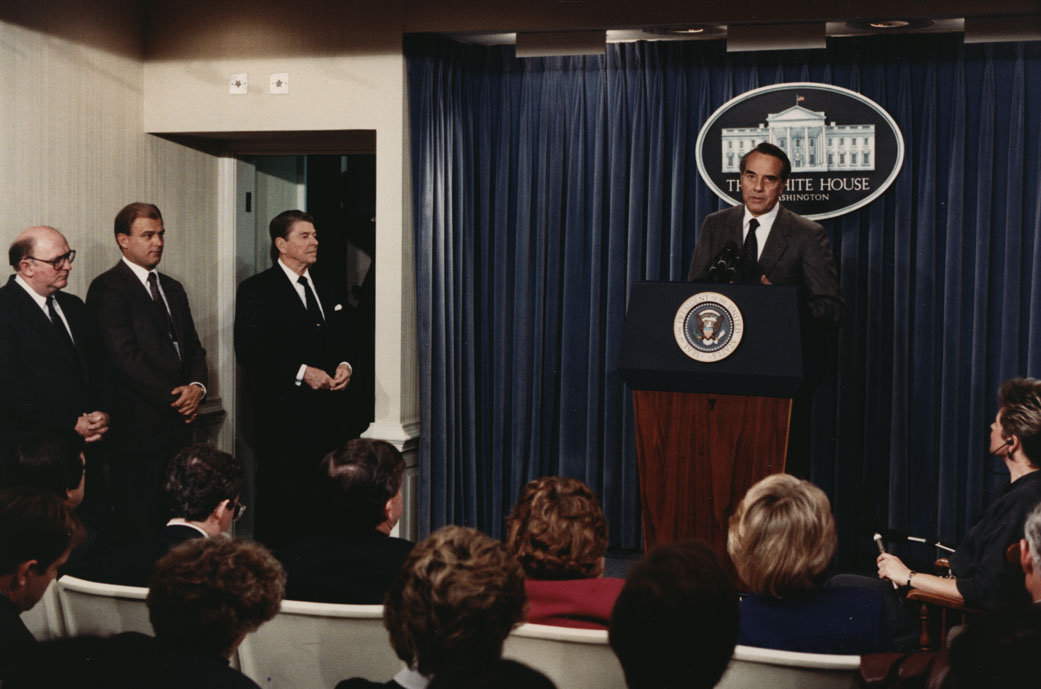 Senator Bob Dole announcing INF Treaty as President Ronald Reagan looks on, 1987 | Dole Archive Collections
