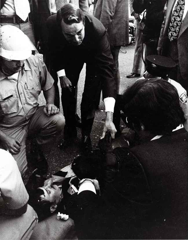 Dole, Robert J., 1923-, Bob Dole holding hand of Shreveport, Louisiana police offer as he is lying on the ground. A fire department official and a small crowd watches.