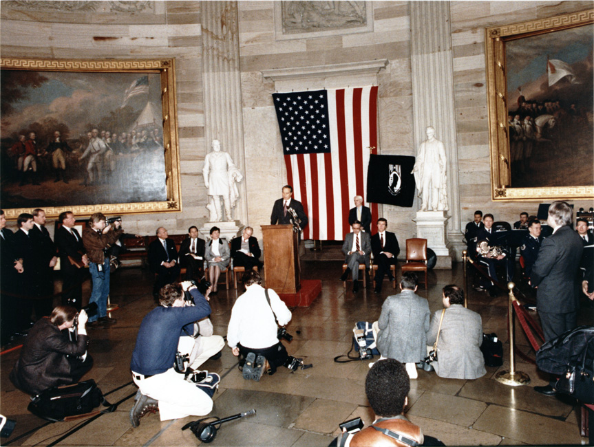 Dole, Robert J., 1923-; Mitchell, George J. (George John), 1933-; McCain, John, 1936-; Cohen, William S.; Senator Dole at a podium in the U.S. Capitol giving a speech during a ceremony honoring the POW/MIA flag. The flag is permanently included within the rotunda. A U.S. flag hangs in the background. Senators and band are on his left. Unknown are on his right. Reporters are in front. Paintings and Statues are behind him.