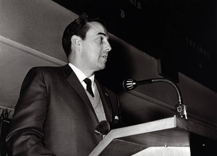 Senator Bob Dole speaking at a podium at FAO Conference in Italy