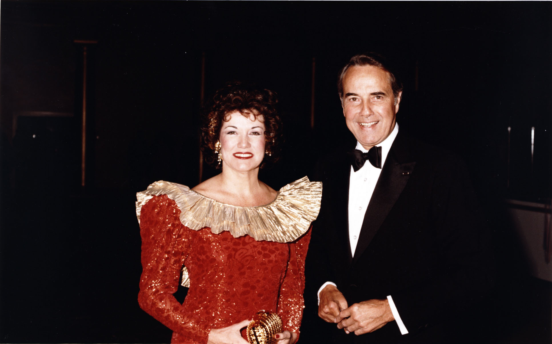 Dole, Elizabeth Hanford; Dole, Robert J., 1923-; Bob and Elizabeth Dole smile at the camera during President Reagan's 1985 Inaugural Ball. Elizabeth is wearing a red dress and Senator Dole is wearing a tuxedo.