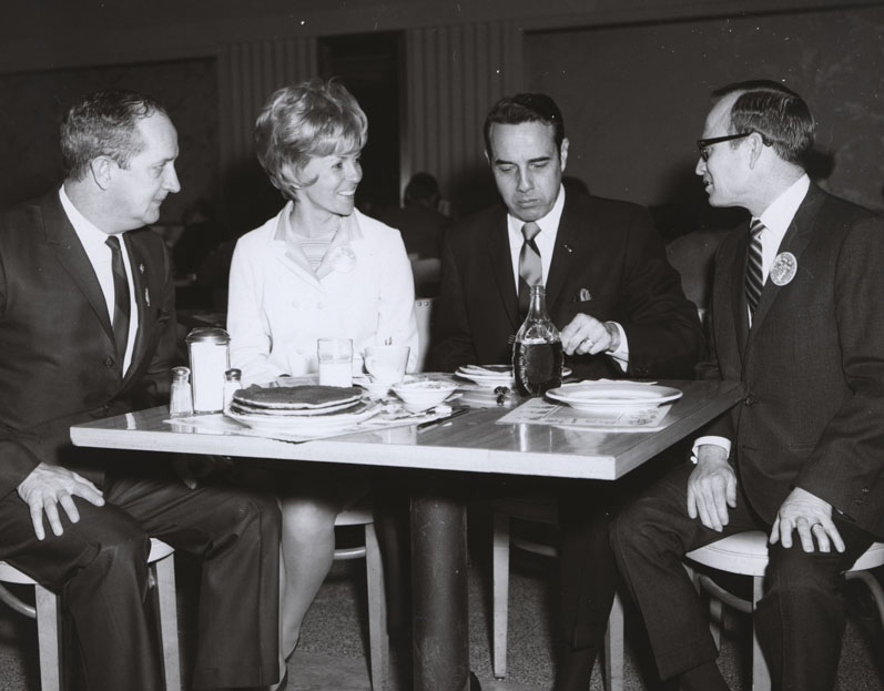 Sebelius, Keith George; ____; Dole, Robert J., 1923-; ______; Senator Bob Dole sitting with Congressman Keith Sebelius and two other people while talking and eating pancakes.