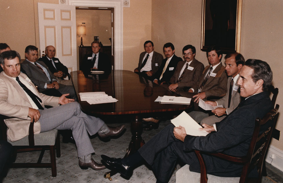 Likes, Dee; Beam, Mike; Frick, Jack; Brinkman, Gene; Meetz, Jim; Hineman, Don; Clarkson, Lloyd; Wells, Ron; Kohen, Harold; Smith, Don; Weibert, Warren; Dole, Robert J., 1923-; Senator Dole sits at a table with members of the Kansas Livestock Association in the U.S. Capitol room S-230.