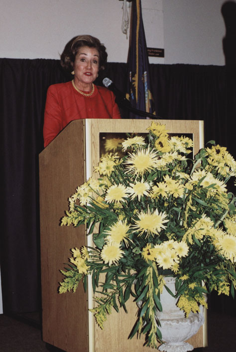 Senator Elizabeth Dole stands at a podium while giving a speech on Kansas Day. Flowers sit in front of the podium.