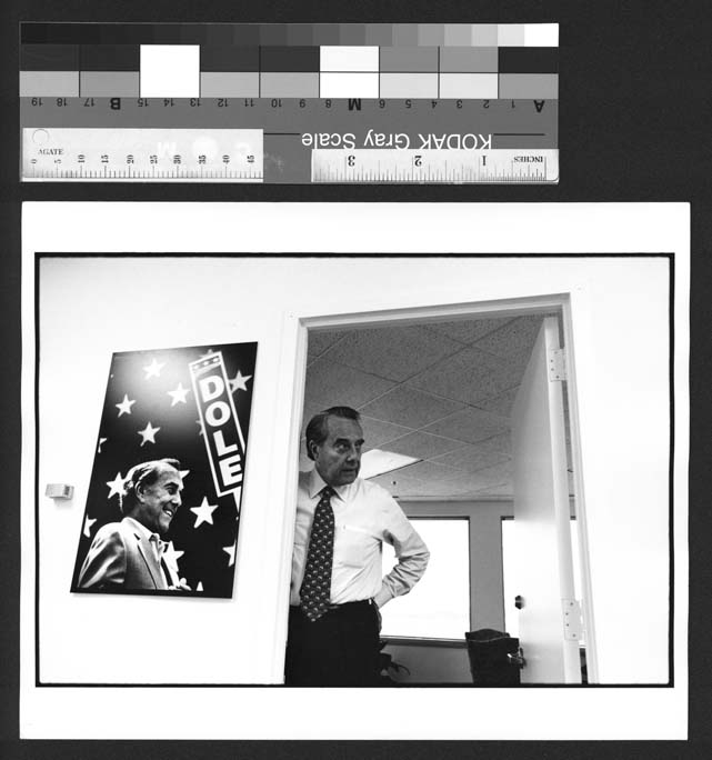 Dole, Robert J., 1923-; Bob Dole is standing in the doorway with a poster of Dole on the wall next to him.