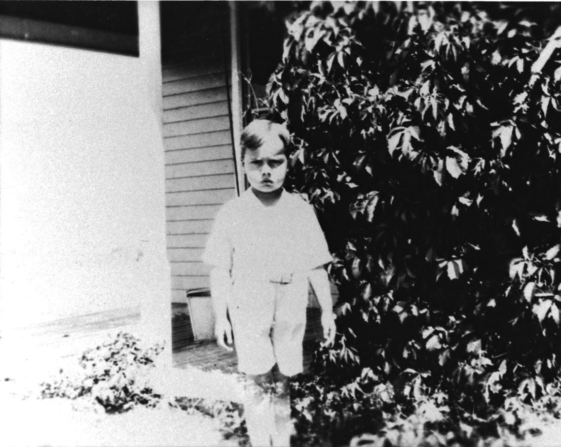 Item 1: Bob Dole about age 5. Notes: (same as AutoNumber 9), black and white, snapshot, Dole, Robert J., 1923-; Dole is standing in front of a bush and house in shorts.