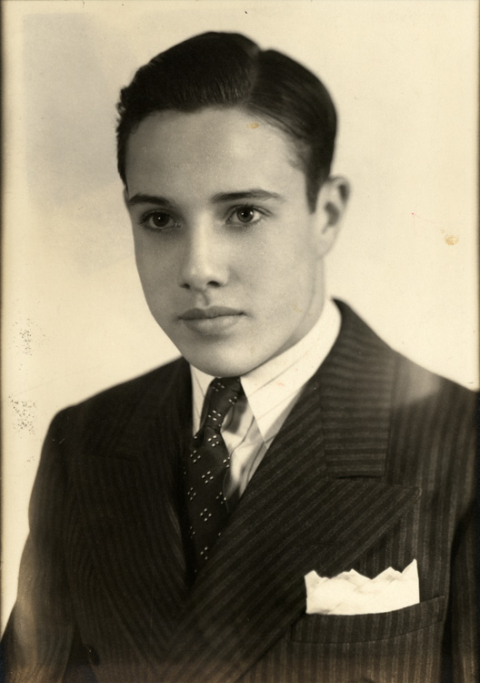 Item 7: Russell High School portrait of Bob Dole. Black and white, portrait, wallet size, Dole, Robert J., 1923-; Dole is wearing a striped suit with a pocket handkerchief in the top pocket, the tie has a geometric pattern and he has on a white shirt.