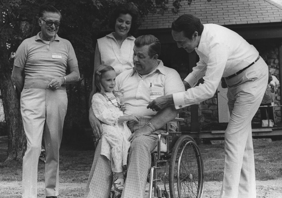 Dole, Robert J., 1923-; Dole, Elizabeth Hanford; unidentified girl, unidentified men; the girl is sitting on the unidentified man in the wheelchair's lap, Dole is leaning over to hand the girl something, Elizabeth Hanford is standing behind them watching
