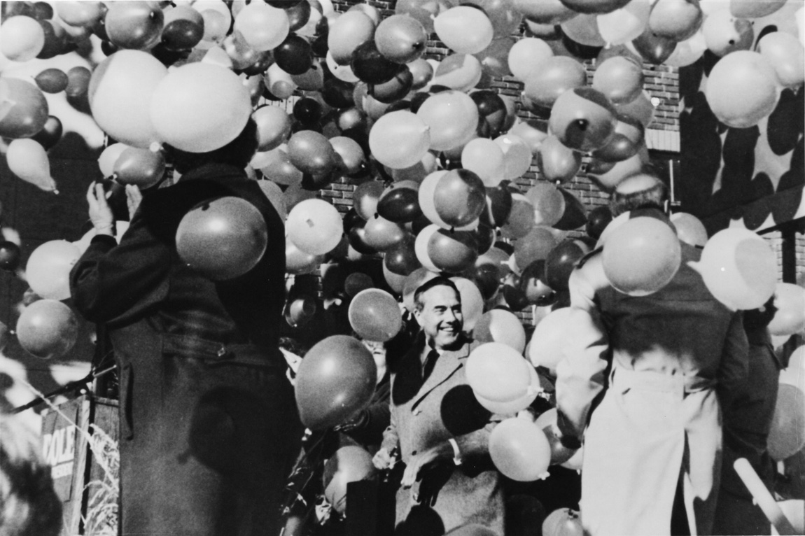Presidential candidate Bob Dole standing amidst balloons, 1996 | Dole Archive Collections