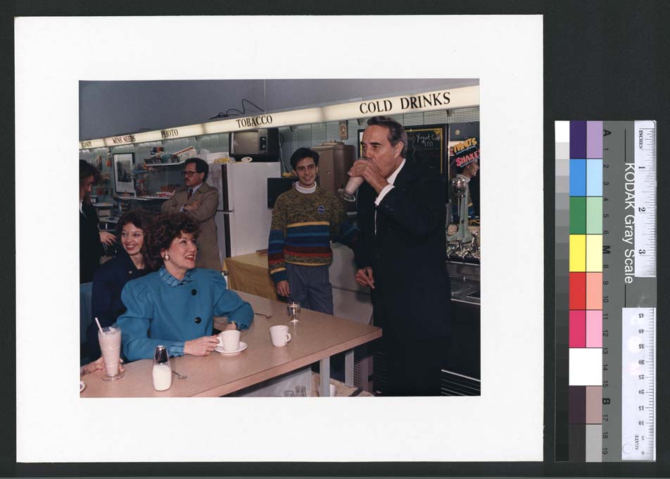 Dole, Robin; Dole, Elizabeth Hanford; Dole, Robert J., 1923-; Bob Dole is drinking a milkshake, Elizabeth Dole watches Bob Dole from a counter