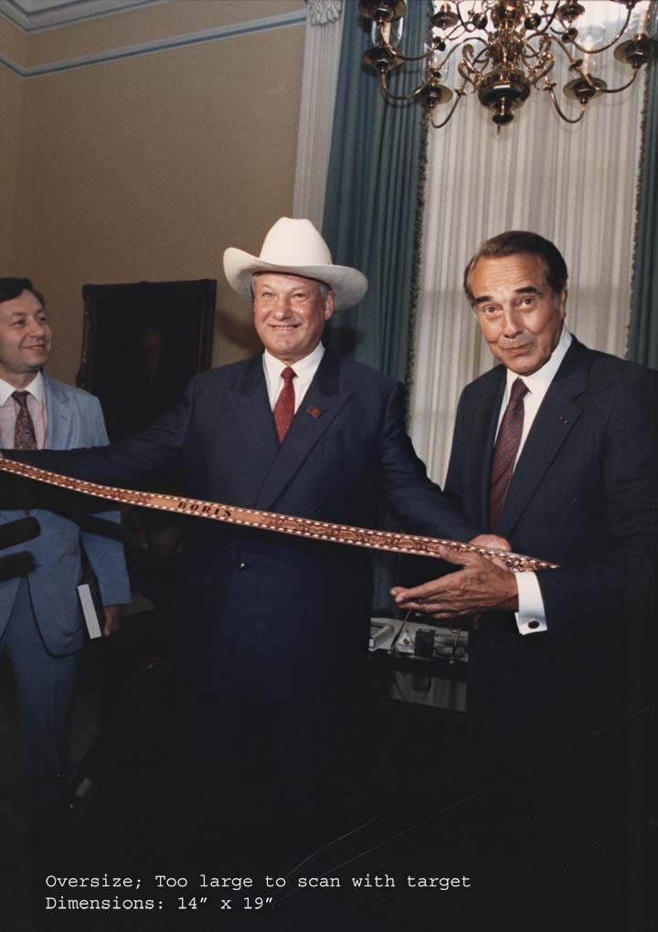 Yeltsin, Boris Nikolayevich; Dole, Robert J., 1923-; Yeltsin is wearing a cowboy hat and holding a leather belt that reads Boris