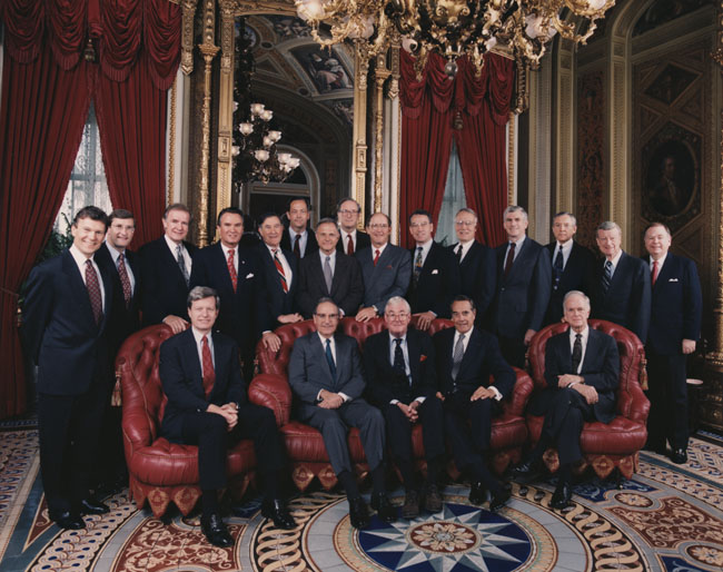 Daschle, Thomas; Pryor, David, 1934-; Packwood, Bob; Durenberger, David; Bradley, Bill, 1943-; Matsunaga, Spark M., 1916-1990; Moynihan, Daniel P. (Daniel Patrick), 1927-2003; Riegle, Donald W., 1938-; Rockefeller, John D. (John Davidson), 1937-; Danforth, John C.; Bentsen, Lloyd; Boren, David, 1941-; Roth, William V., 1921-; Chaffee, John H., 1922-1999; Heinz, John, 1938-1991; Armstrong, William Lester; Symms, Steven D. (Steven Douglas), 1938-; Baucus, Max; Mitchell, George J. (George John), 1933-; Dole, Robert J., 1923-; posed portrait of the Senate Finance Committee in 1989 Robert J. Dole was Chairman from 1981-1985
