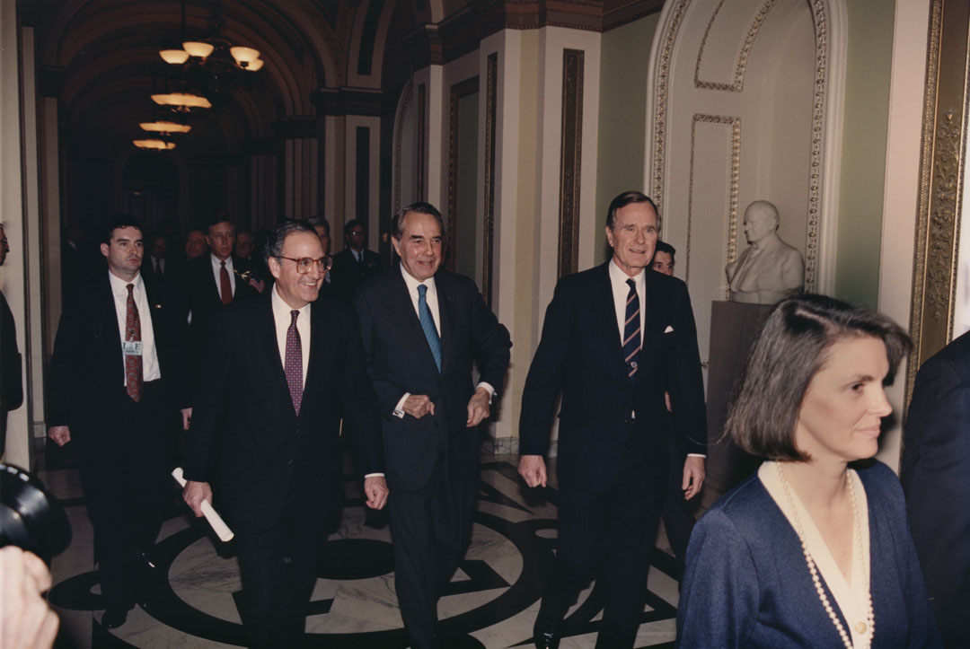 Senator Bob Dole walking with President George H. W. Bush and Senator George Mitchell on day of a meeting, 1991