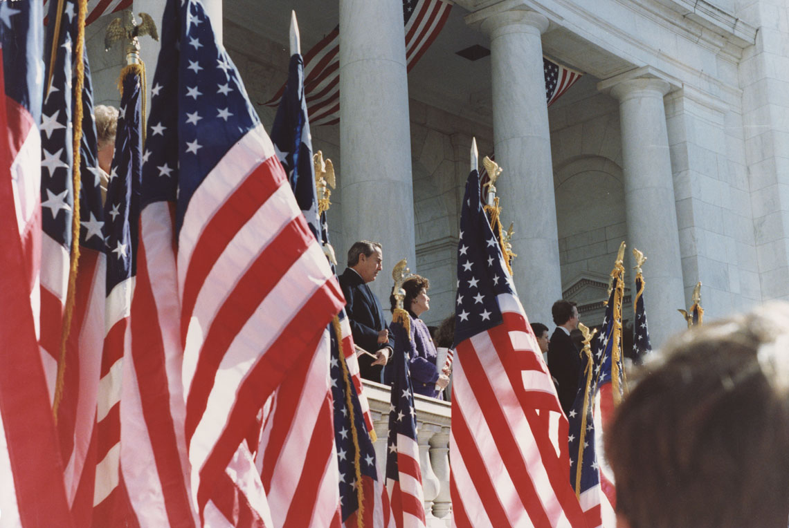 Dole, Elizabeth Hanford; Dole, Robert J., 1923-; Senators Dole are standing on a balcony in the background, in the foreground are several American Flags