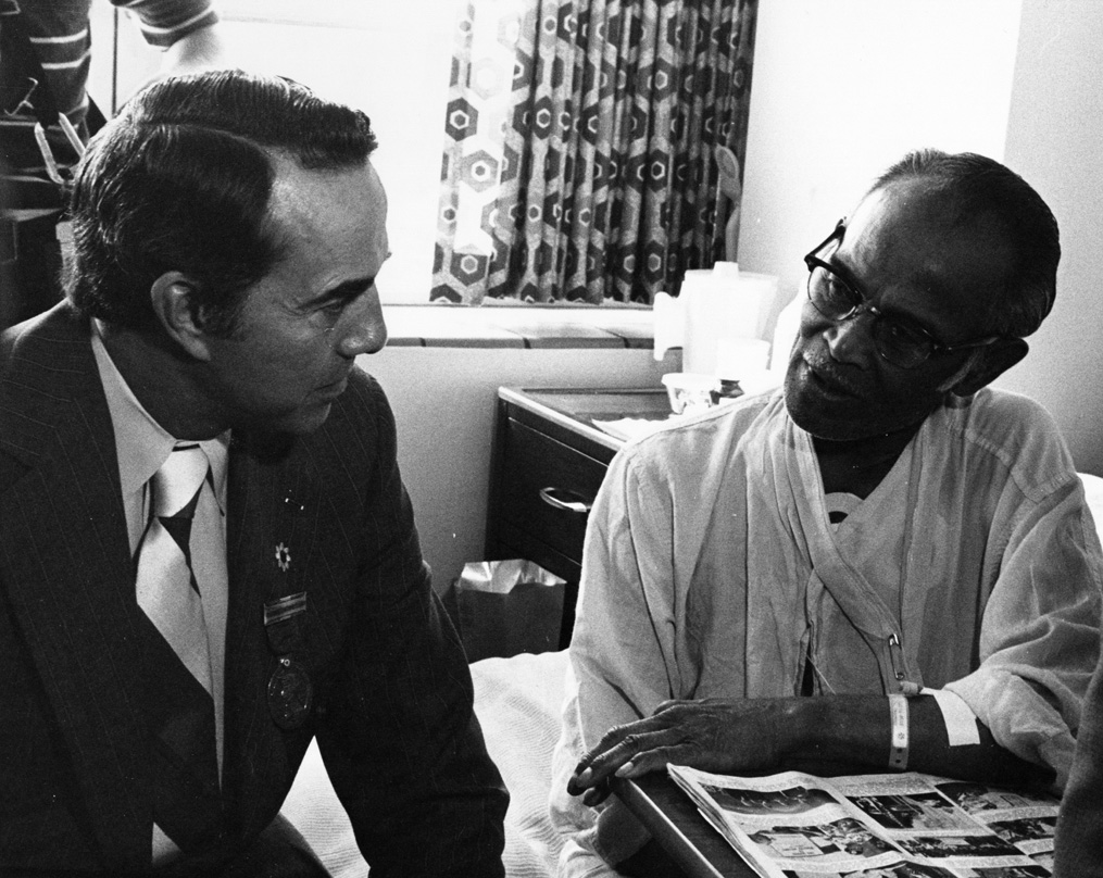 Dole, Robert J., 1923-; unidentified man, Dole and a patient are talking, Dole is wearing a medal, the man is has a magazine open