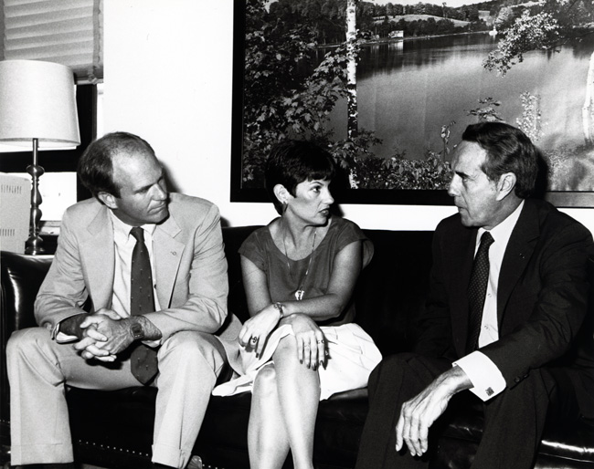 Hurley, Charles "Chuck"; Lightner, Candy; Dole, Robert J., 1923-; Founder of Mothers Against Drunk Driving (MADD) sitting on a sofa in between Senator Dole and unidentified man. A large picture of a lake and trees hangs behind them.