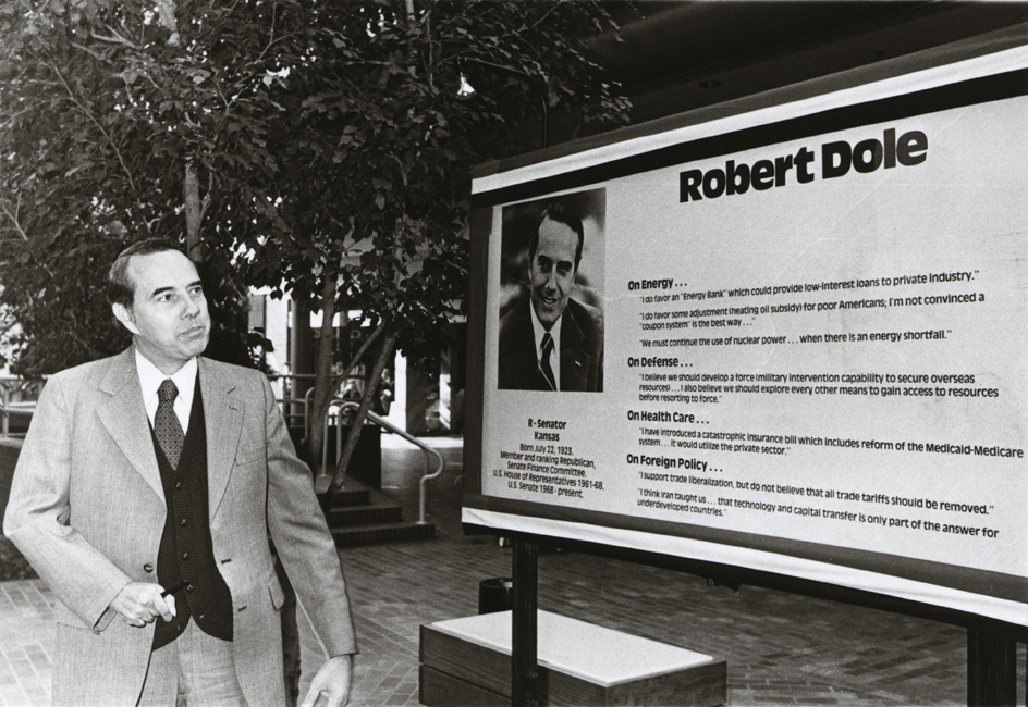 Dole, Robert J., (1923-) Bob Dole looking at one of his campaign signs which includes quotes on his positions on energy, defense, health care, and foreign policy.
