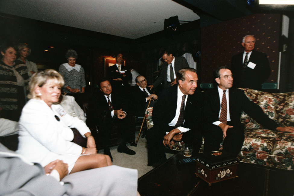 Dole, Robert J., (1923-); Grassley, Charles; Gorton, Slade 1923-); and Rumsfeld, Donald. Bob Dole and Charles Grassley are sitting on a floral couch watching a tv (not shown). Behind them are Slade Gorton and Donald Rumsfeld. There are unidentified people in the picture. There is a coffee table visible that has a decorative box and remote on it.