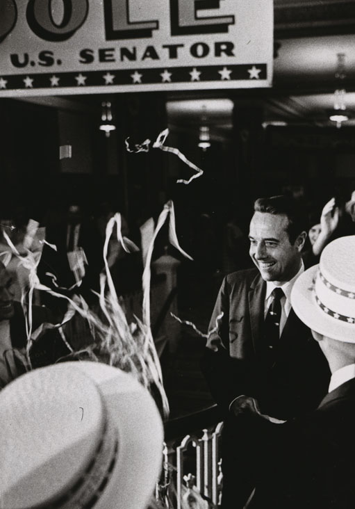 Dole, Robert J., 1923-; In the photograph Bob Dole is standing amongst an unidentified crowd. Above him is a sign that reads, "DOLE U.S. SENATOR."