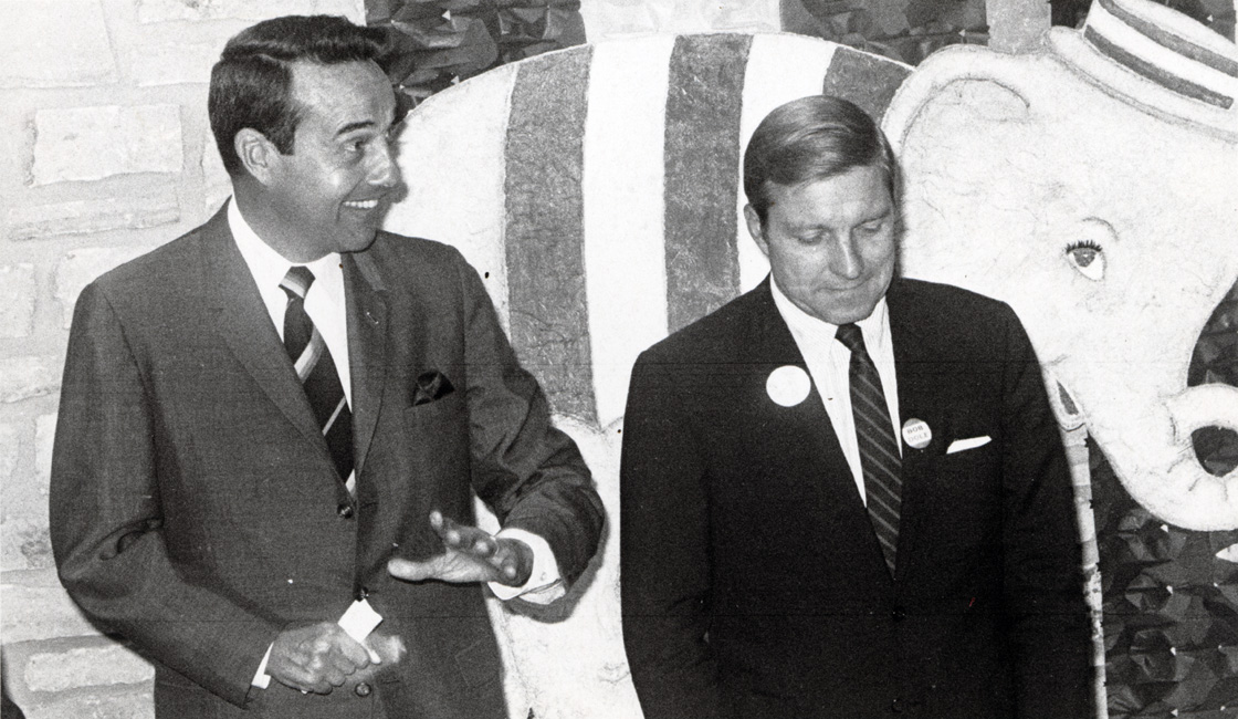 Percy, Charles H., 1919-; Dole, Robert J., 1923-; Bob Dole is speaking to Senator Charles Percy (who is to the left of Bob Dole.) There is a drawing of an elephant behind them.