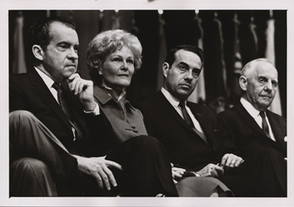 Nixon, Richard M.; Nixon, Pat; Dole, Robert J., 1923-; and Carlson, Frank. They are all sitting down and looking in the same direction. The inscription on the back says, "68 Campaign Folder, Richard Nixon did not campaign in Kansas, but when he was in Kansas City, Missouri, Bob Dole and Senator Carlson were with him on stage Oct 16 [1968]."