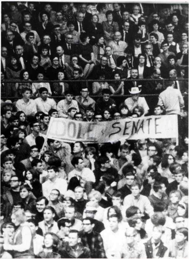 The photograph is of a crowd of unidentified students at a University of Kansas and Kansas State University basketball game. There are students holding up a banner that reads, "DOLE for SENATE."