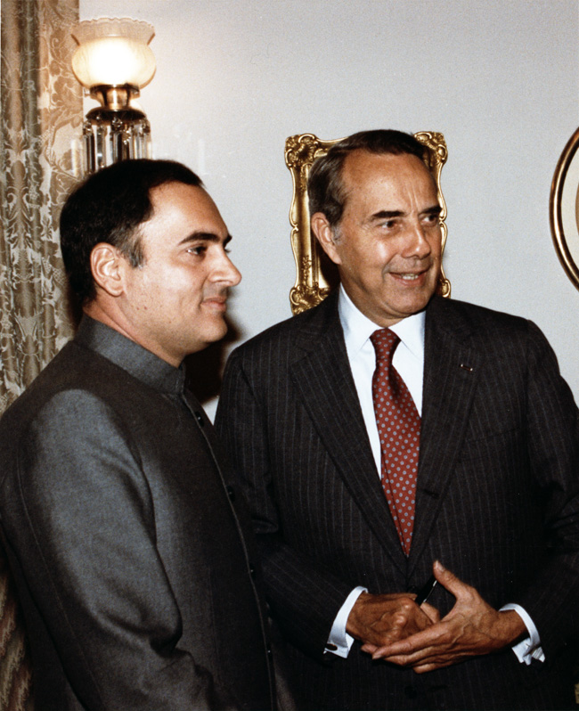 Bob Dole standing with Rajiv Gandhi at reception