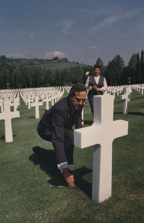 Senator Bob Dole laying a flower at the gravesite of a Kansas G.I., Florence, Italy, 1994