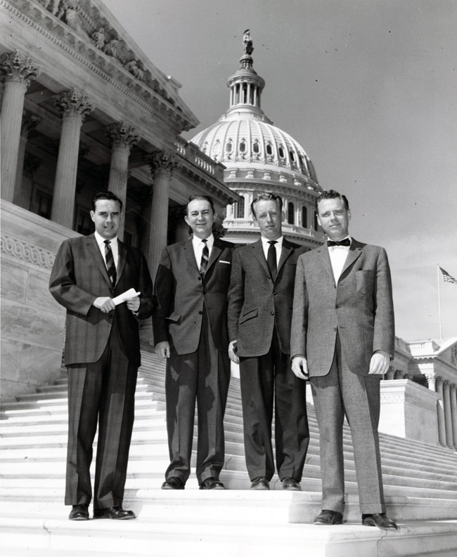 Item 1: Bob Dole with Garner Shriver, Bill Richardson and Walter McVey on the steps of the Senate building, 1961-04-03