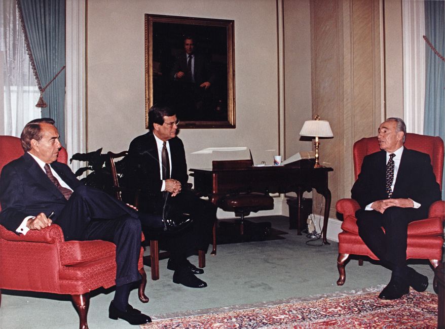 Dole, Robert J., 1923-; Lott, Trent, 1941- and Peres, Shimon, 1923-. Bob Dole and Trent Lott are sitting in separate chairs and facing Shimon Peres who is sitting in another chair. Shimon Peres is speaking and looking at Bob Dole. There is a portrait, a desk with a lamp on it, a rug, a plant and two windows visible in the background. There is a tag taped to the back of the photograph that says, "Senator Dole Senator Trent Lott, Mississippi, Majority Whip S[h]imon Pere[s], Prime Minister of Israel."