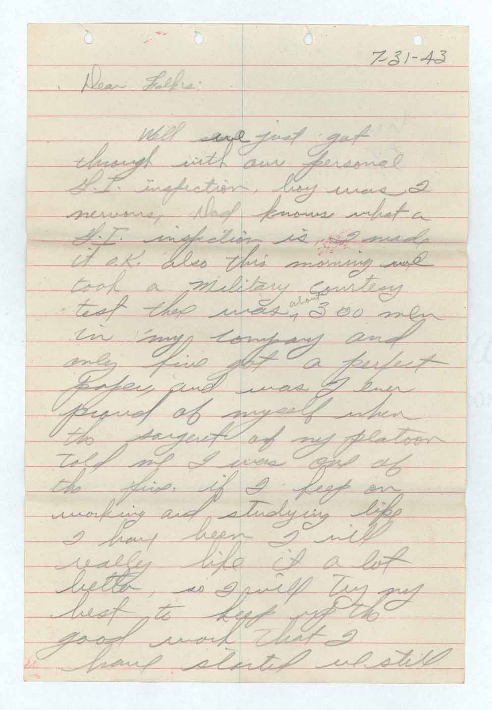 Well we just got through with our personal G.I. inspection, boy was I nervous. Dad knows what a G.I. inspection is. I made it O.K. also this morning we took a Military Courtesy test there was [space indication with about written above] 300 men in my company only five got a perfect paper, and was I ever proud of myself when the sergeant of my platoon told me I was one of the five, if I keep on working and studying like I have been I will really like it a lot better, so I will try my best to keep up the good work that I have started we still