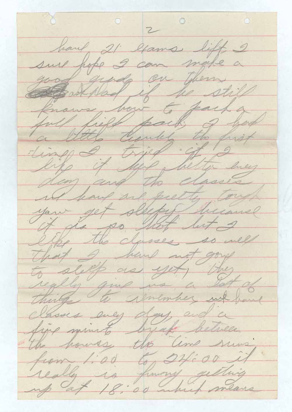 have 21 exams left. I sure hope I can make a good grade on them [scratched out word?] ask Dad if he still knows how to pack a full field pack, I had a little trouble the first time I tried it. I like it here better every day and the classes we have are pretty tough you get sleepy because it is so hot but I like the classes so well that I have not gone to sleep as yet, they really give us a lot of things to remember we have classes every day, and a five minute break between the hours, the time runs from 1:00 to 24:00 it really is funny getting up at 18:00 which means