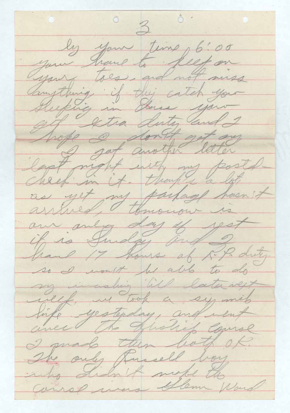 I got another letter last night with my postal-check in it. thank’s a lot, as yet my package hasn’t arrived, tomorrow is our only day of rest it is Sunday and I have 17 hours of R.P. duty, so I won’t be able to do my washing till later next week. We took a six mile hike yesterday, and went over the obstacle course I made them both O.K. The only Russell boy who didn’t make the course was Glenn Ward
