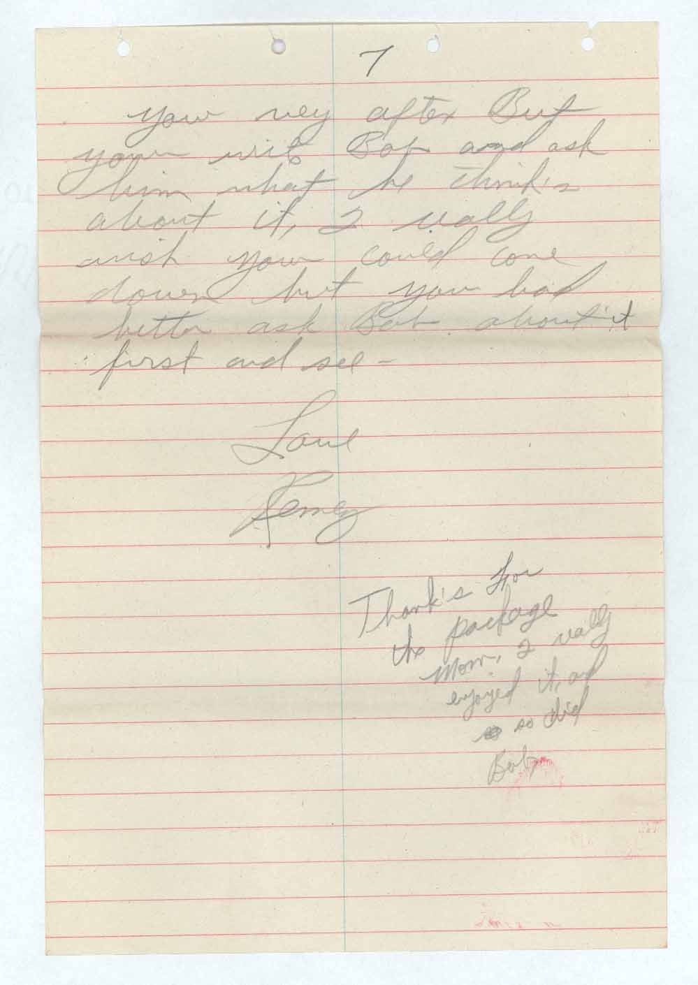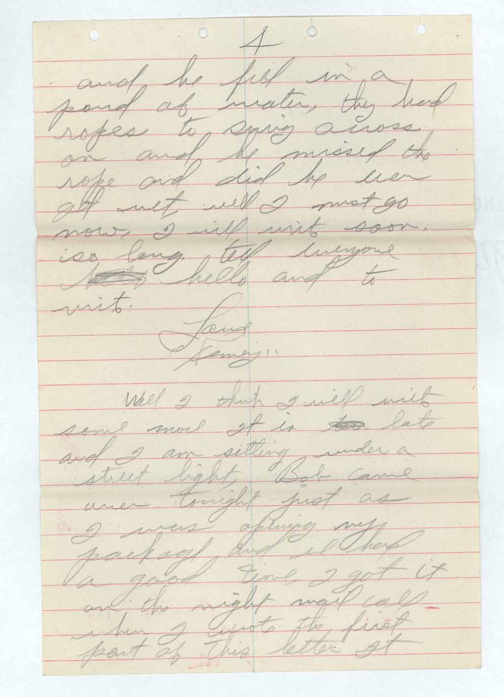 Well I think I will write some more It is lae late and I am sitting under a street light. Bob came over tonight just as I was opening my package and