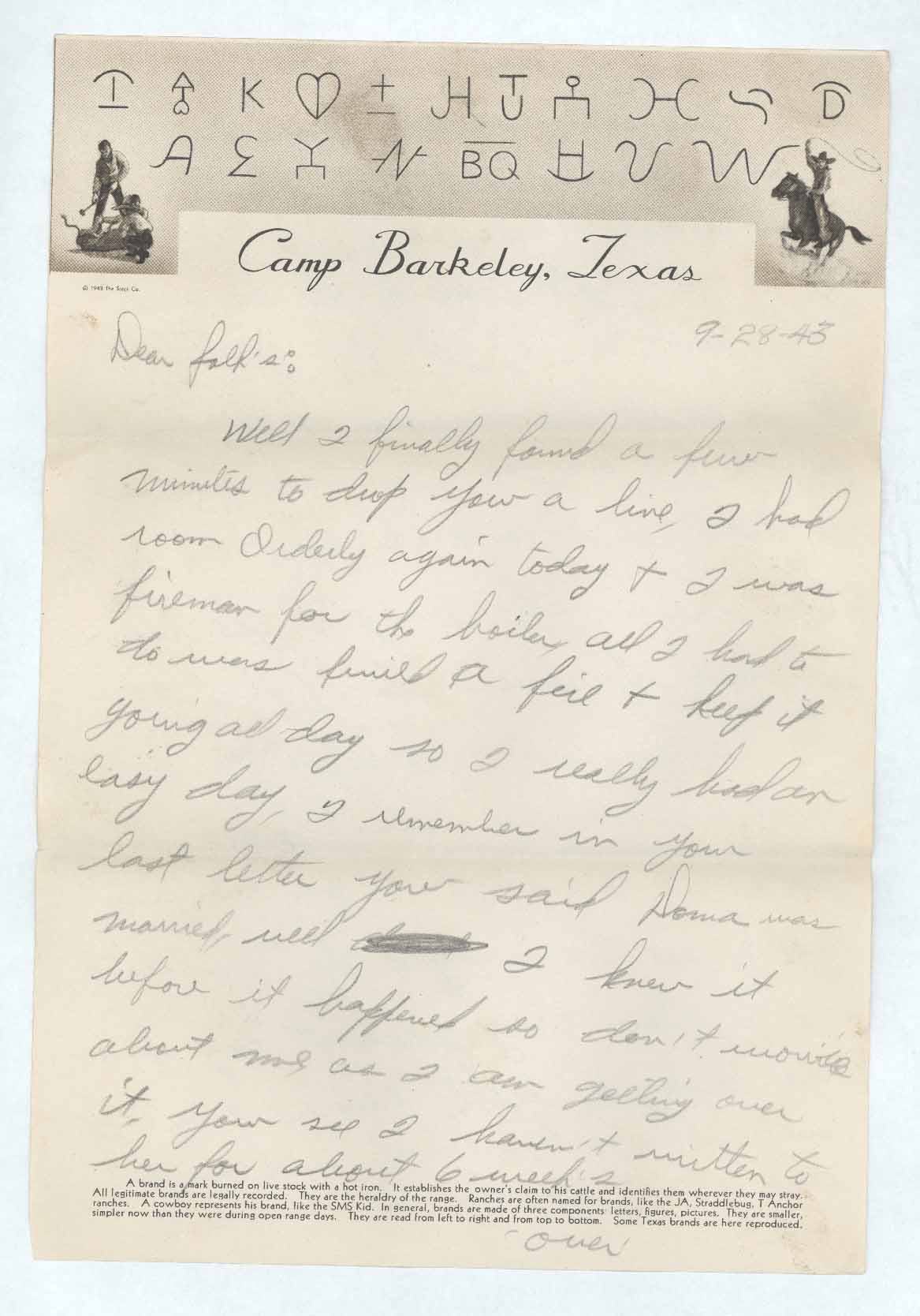 Well I finally found a few minutes to drop you a line. I had room Orderly again today & I was fireman for the boiler all I had to do was build a fire & keep it going all day so I really had an easy day. I remember in your last letter you said Donna was married, well don’t I knew it before it happened so don’t worrie [sic] about me, as I am getting over it. You see I haven’t written to her for about 6 week’s