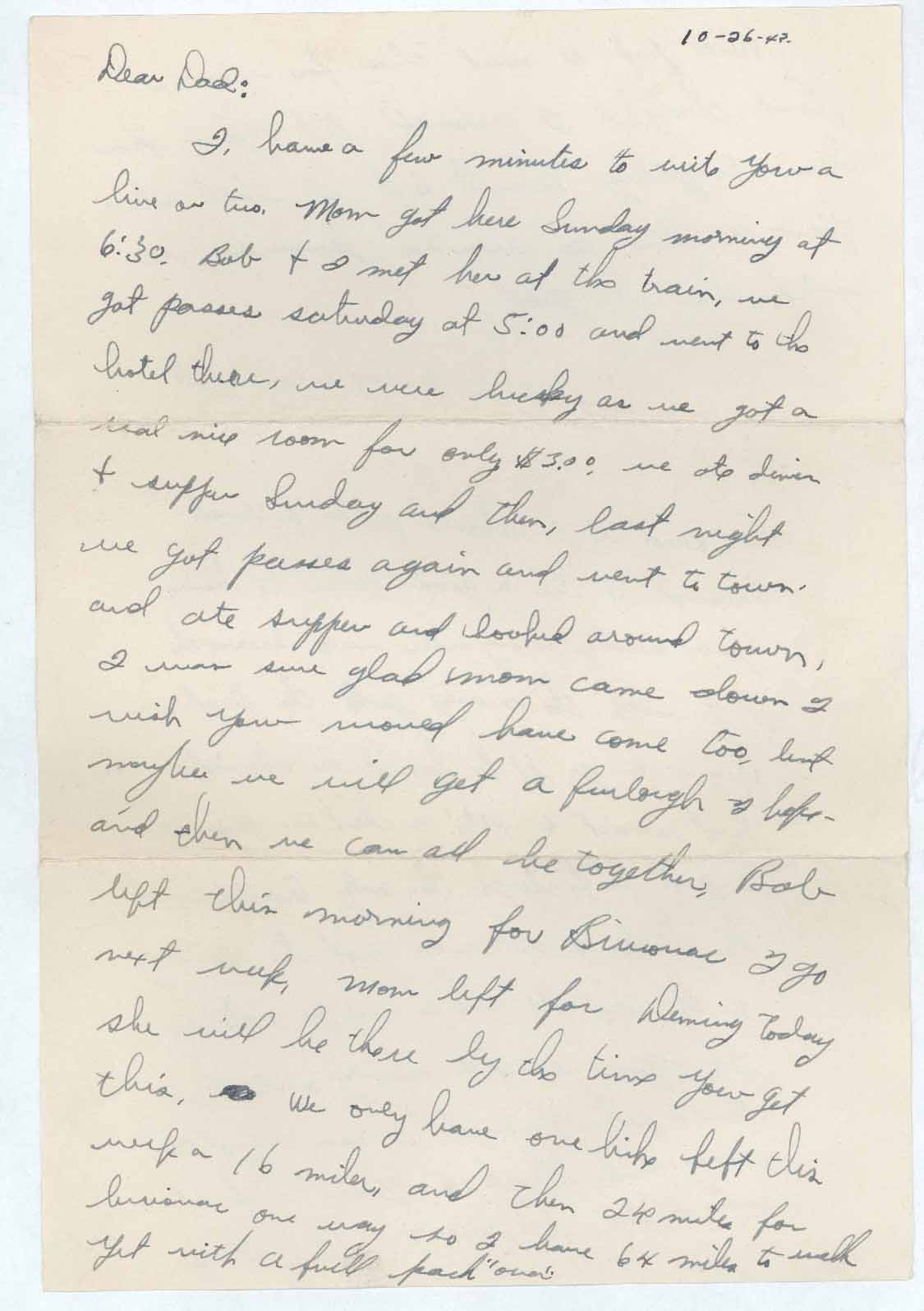 I. have a few minutes to write you a line or two. Mom got here Sunday morning at 6:30. Bob & I met her at the train, we got passes saturday [sic] at 5:00 and went to the hotel there, we were lucky as we got a real nice room for only $3.00, we ate dinner & supper Sunday and then, last night we got passes again and went to town and ate supper and looked around town. I was sure glad mom came down I wish you would have come too, but maybe we will get a furlough – I hope – and then we can all be together. Bob left this morning for Bivouac I go next week, mom left for Denning today she will be there by the time you get this. as We only have one hike left this bivouac one way so I have 64 miles to walk yet with a full pack. “over”