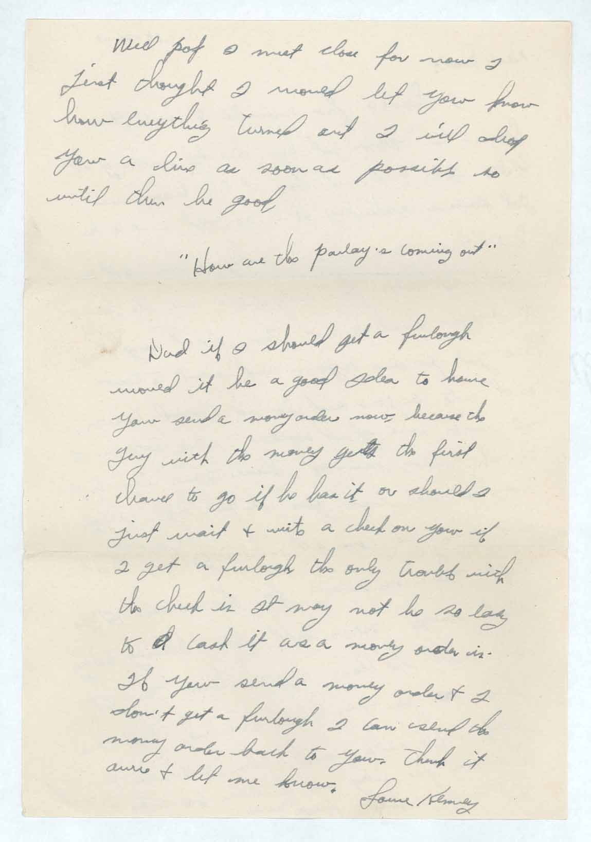 Dad if I should get a furlough would it be a good idea to have you send a money order now, because the guy with the money gets the first chance to go if he has it or should I just wait & write a check on you if I get a furlough, the only trouble with the check is it may not be so easy to I cash it as a money order is. If you send a money order & I don’t get a furlough I can send the money order back to you. Think it over & let me know.