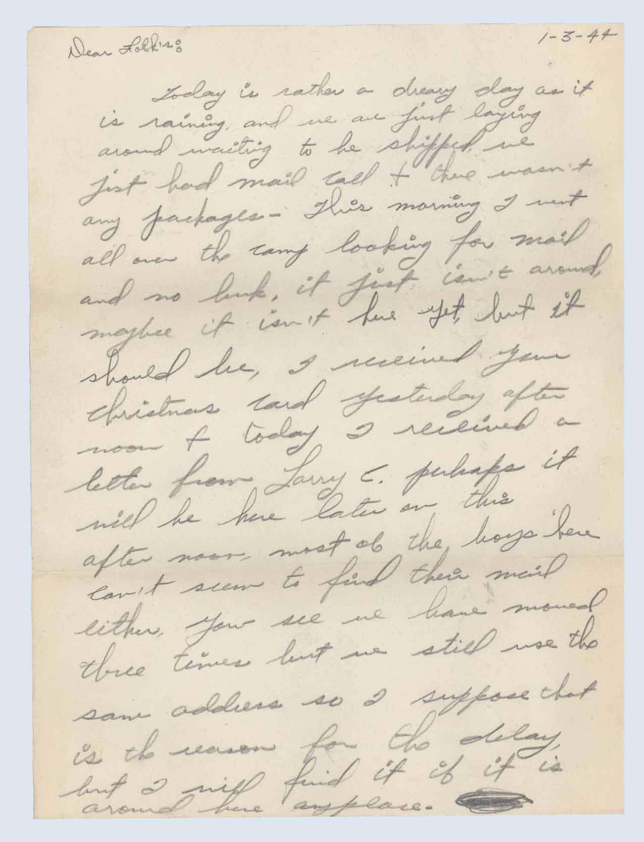 Today is rather a dreary day as it is raining and we are just laying around waiting to be shipped, we just had mail call & there wasn’t any packages- This morning I went all over the camp looking for mail and no luck, it just isn’t around, maybe it isn’t here yet, but it should be, I received your Christmas card yesterday after noon & today I received a letter from Larry C. perhaps it will be here later on this after noon, most of the boys here can’t seem to find their mail either, You see we have moved three times but we still use the same address so I suppose that is the reason for the delay, but I will find it if it is around here anyplace. [Scratching something out]
