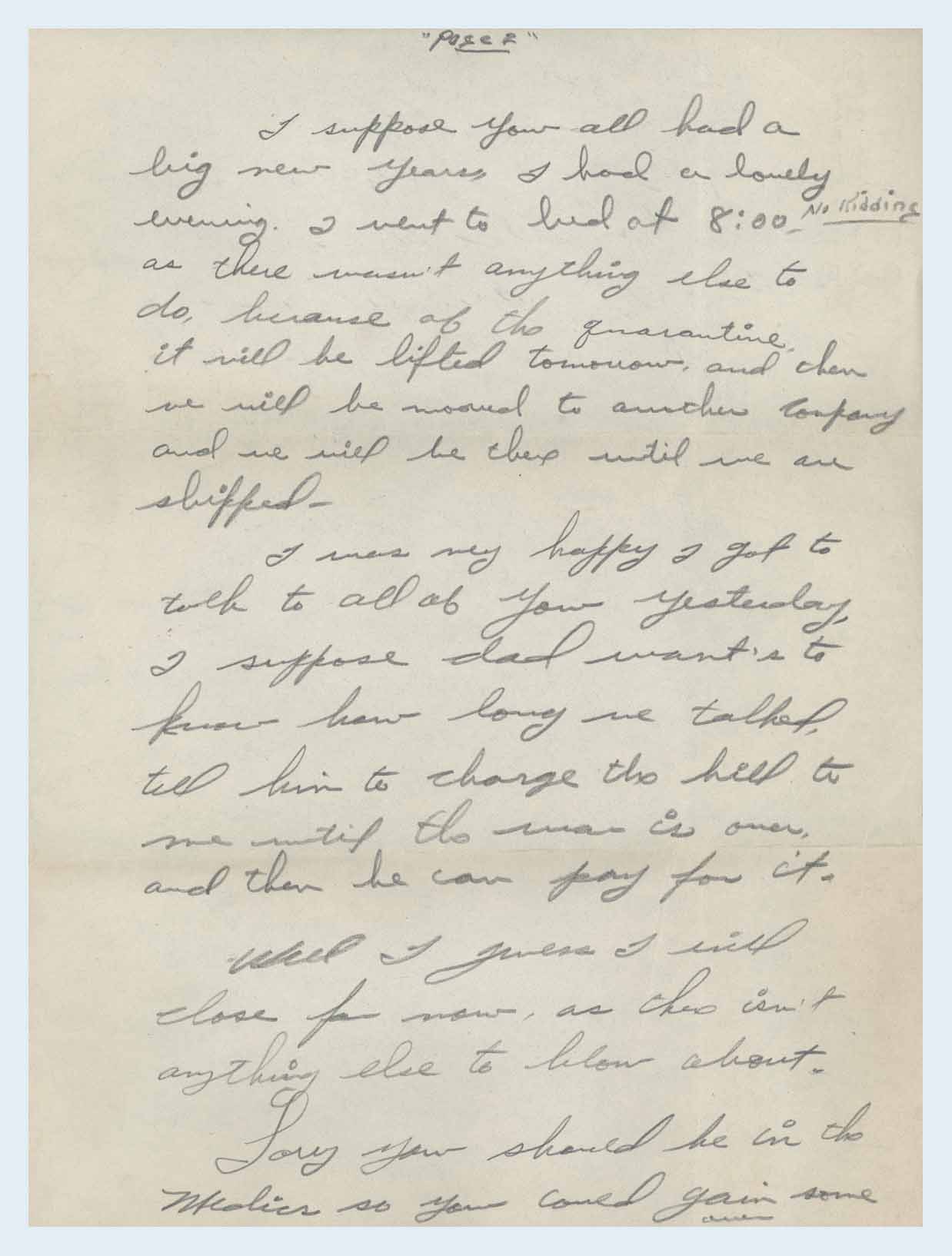 I was very happy I got to talk to all of you yesterday, I suppose dad want’s to know how long we talked, tell him to charge the bill to me until this war is over, and then he can pay for it.