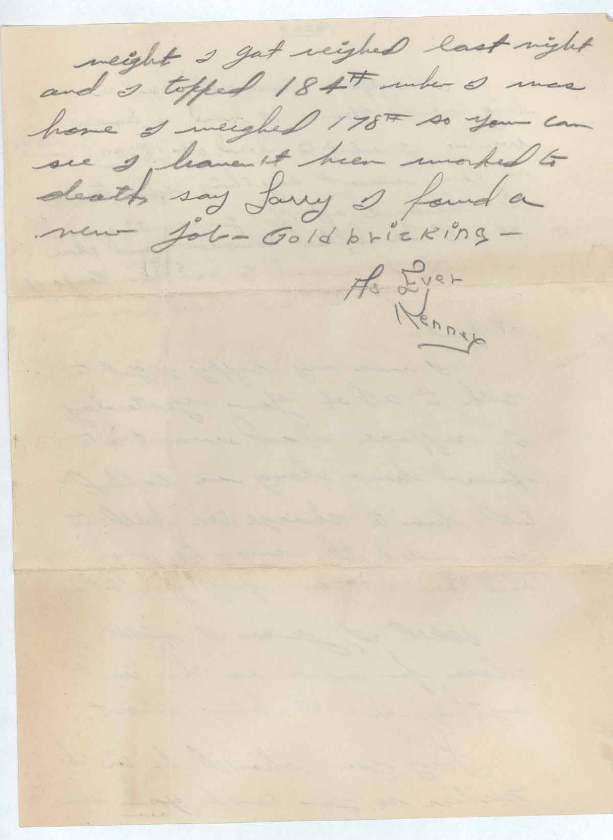 weight I got weighed last night and I topped 184# when I was home I weighed 178# so you can see I haven’t been worked to death, say Larry I found a new job – Gold bricking- [Gold bricking is printed]