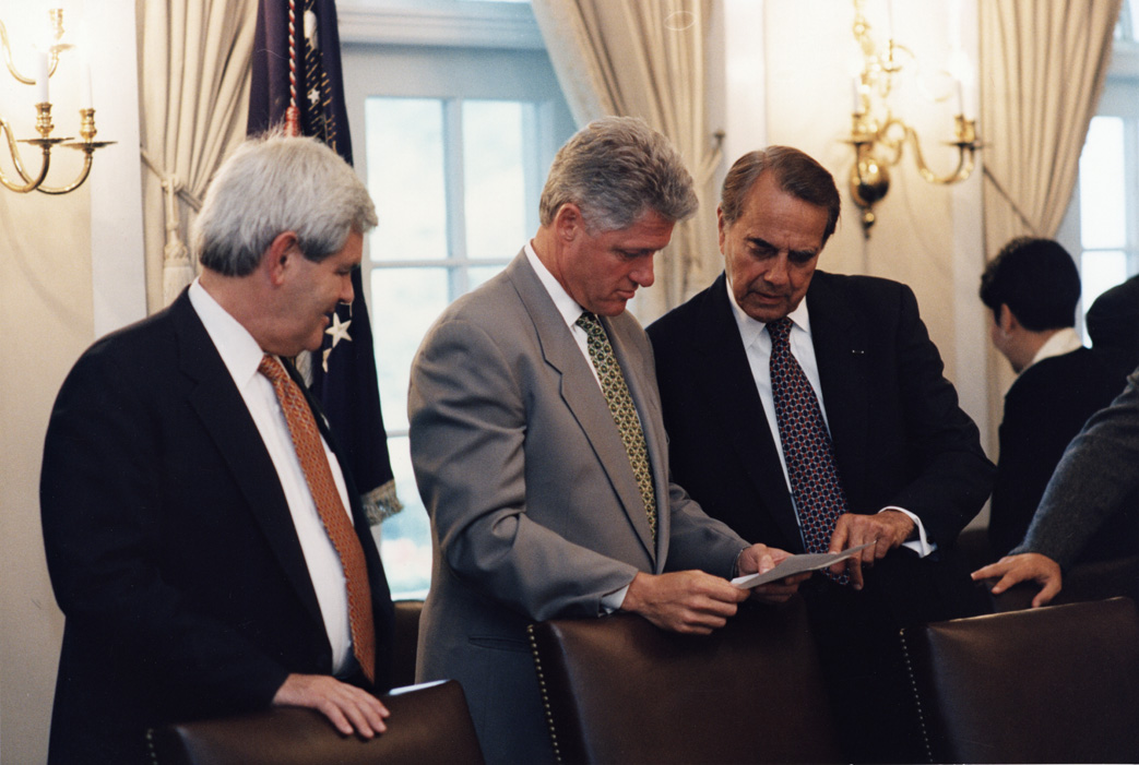 Senator Dole and President Clinton look at a paper while Newt Gingrich looks on.