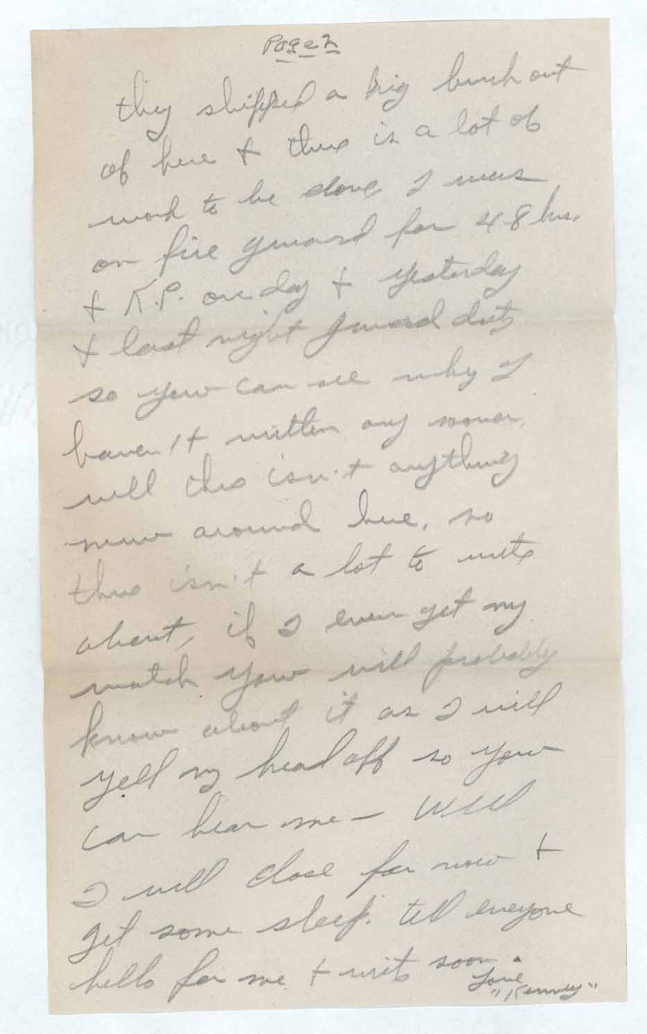 they shipped a big bunch out of here & there is a lot of work to be done, I was on fire guard for 48 hrs. & K.P. one day & yesterday & last night guard duty so you can see why I haven’t written any sooner will this isn’t anything new around here, so there isn’t a lot to write about, if I ever get my watch you will probably know about it as I will yell my head off so you can hear me -- Well I will close for now & get some sleep. Tell everyone hello for me & write soon.